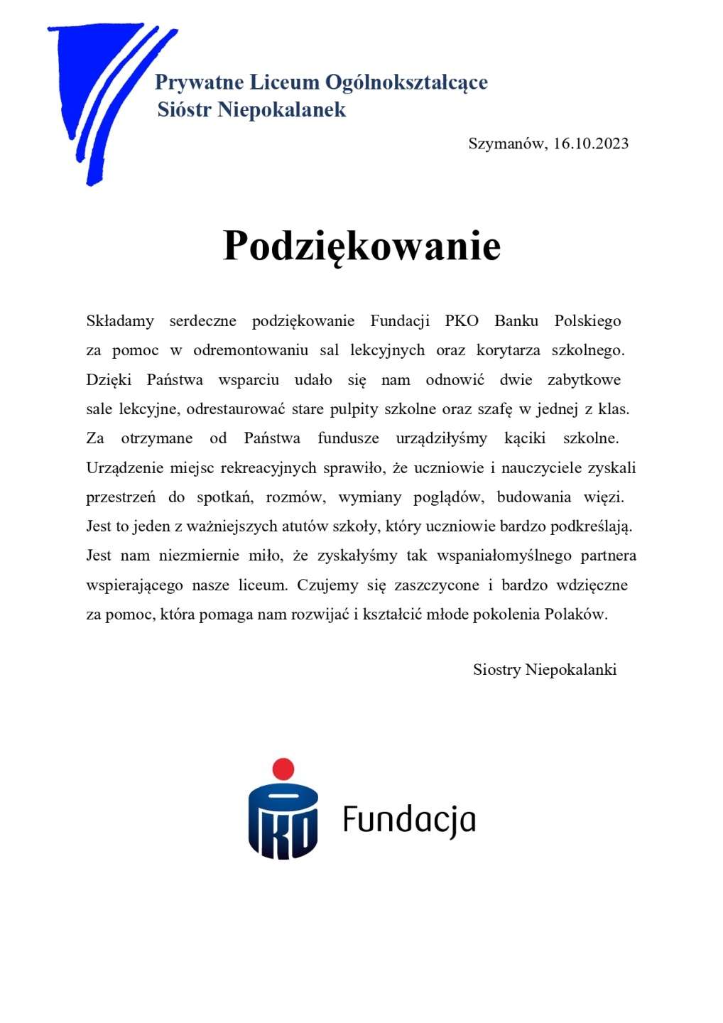 Podziękowanie Fundacji PKO Banku Polskiego